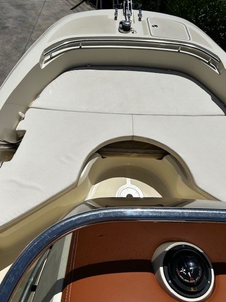 Banquette avant en U inversé avec sellerie crème et coffre de rangement
