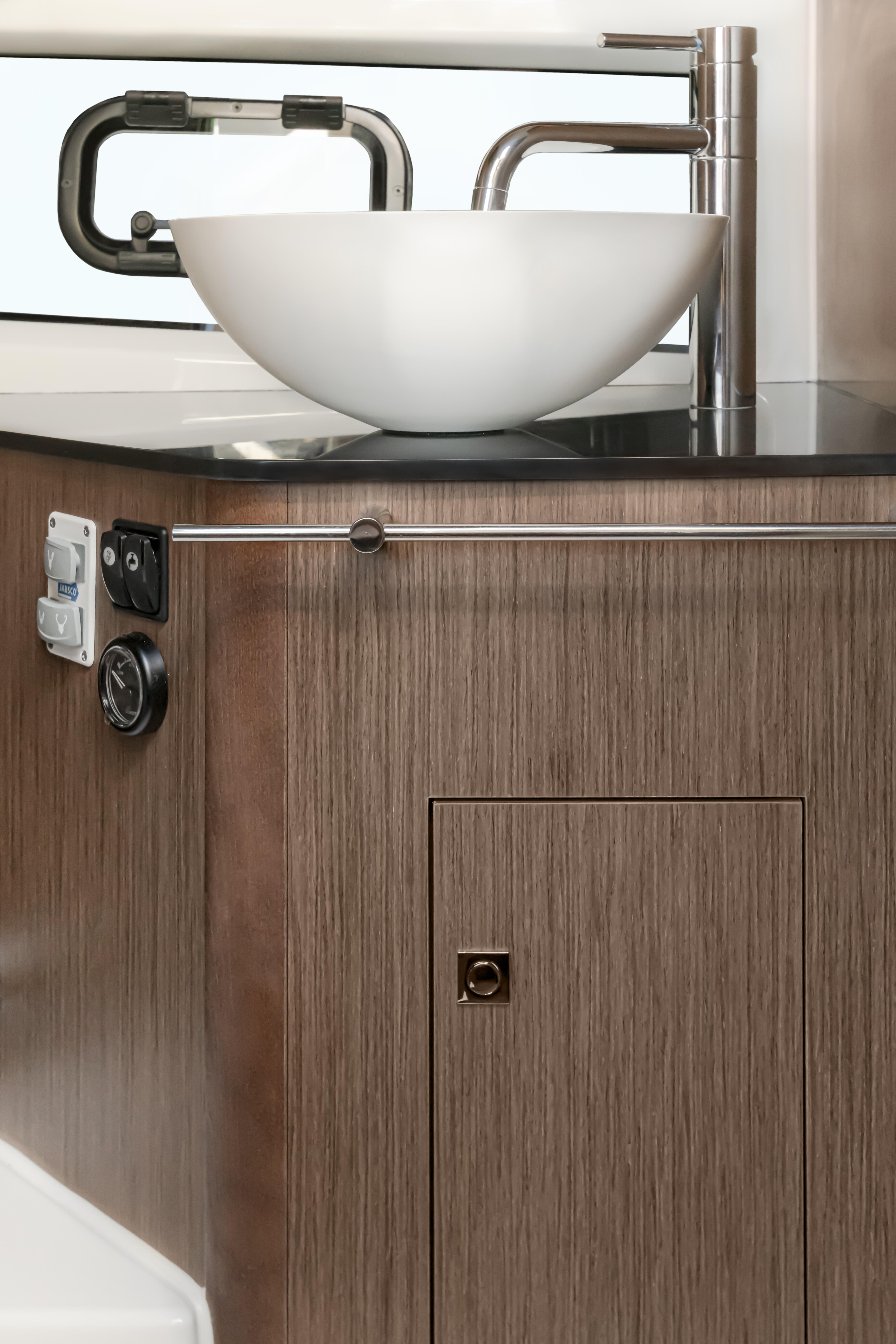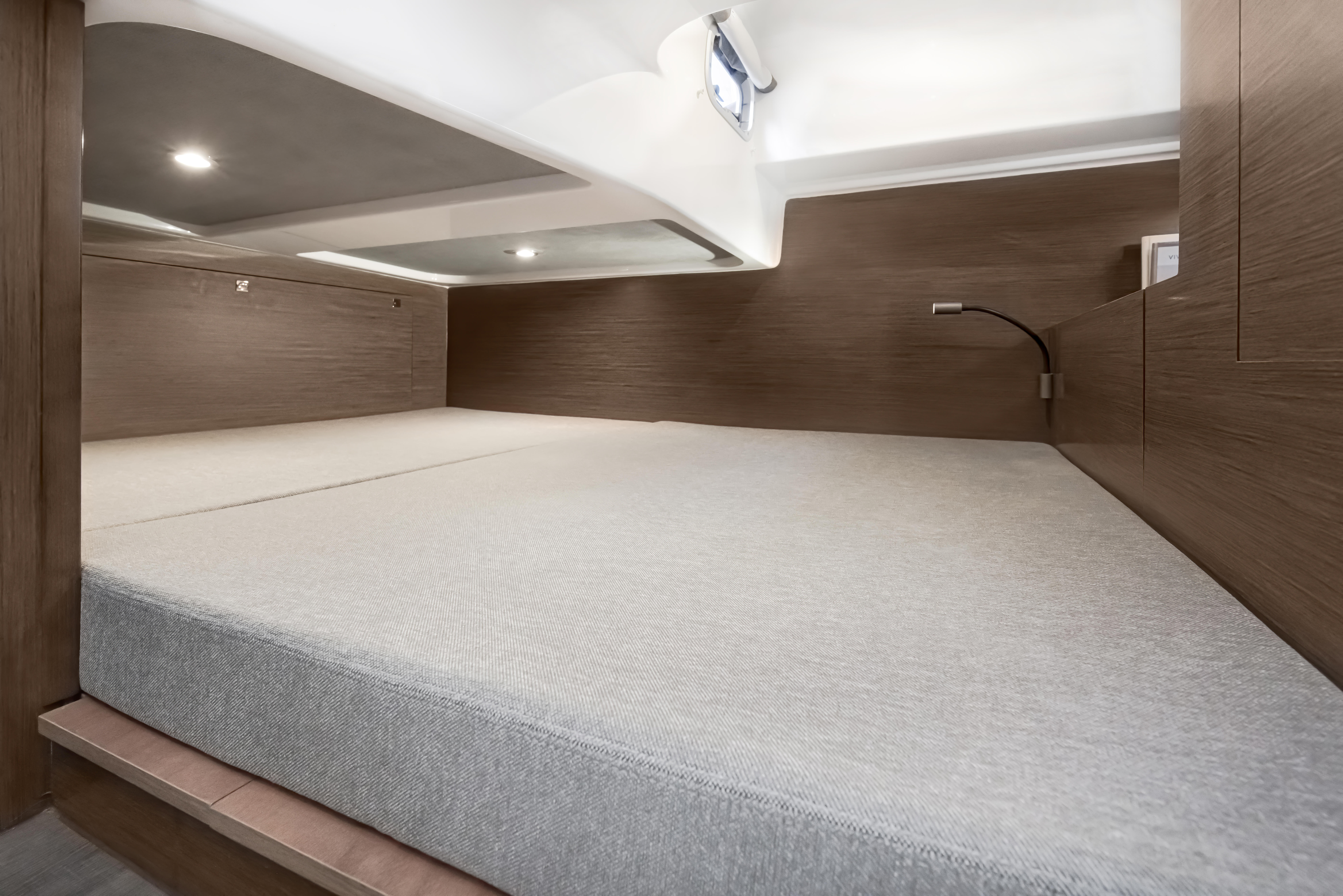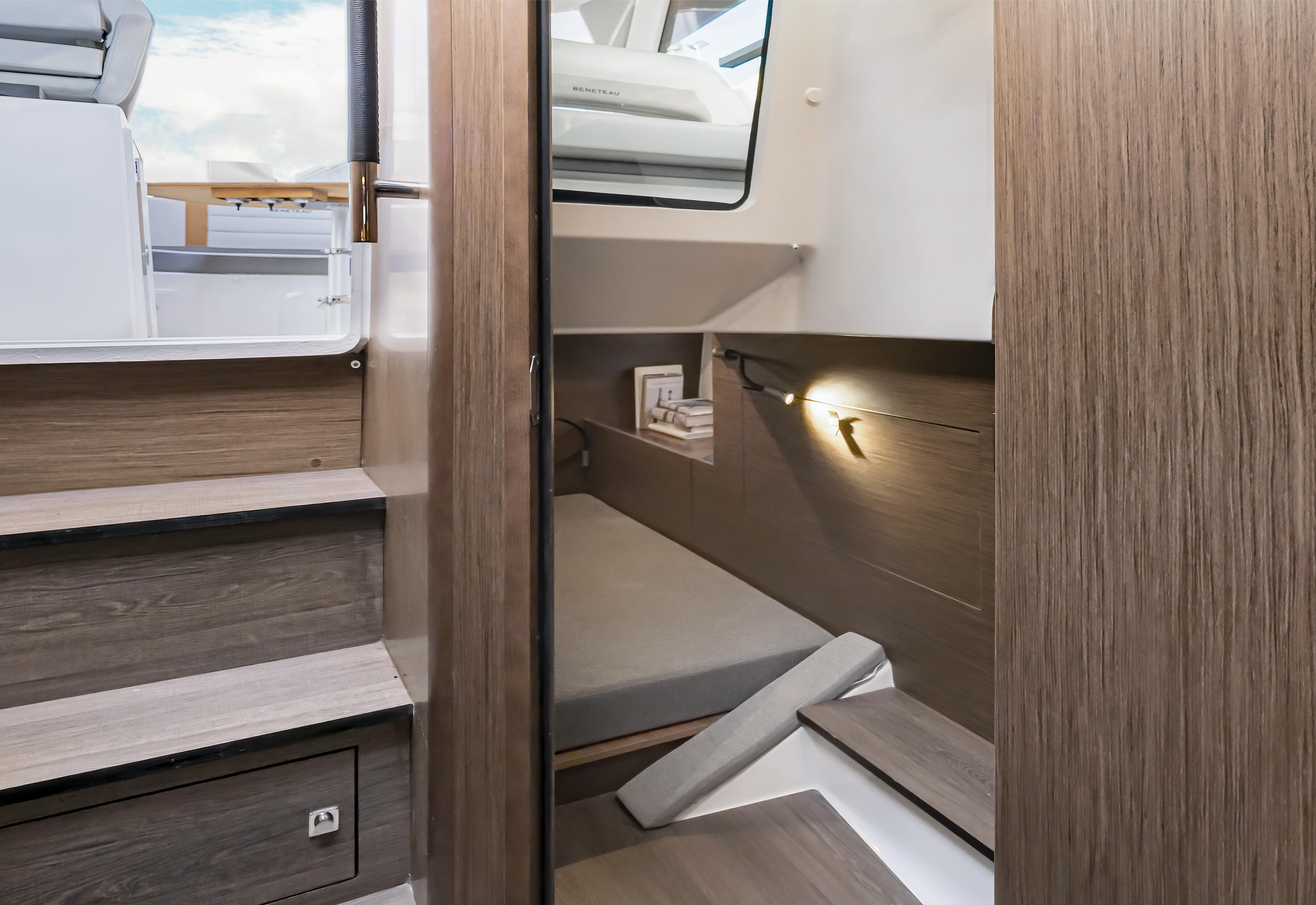 Proposant deux double-couchages et une véritable salle d’eau avec douche séparée des toilettes, le Gran Turismo 32 garantit de bien agréables nuits à bord. Baignées d’une douce lumière grâce aux longs vitrages de coque, la cabine centrale et la mid-cabine disposent d’une généreuse colonne de rangement en bas de la descente.