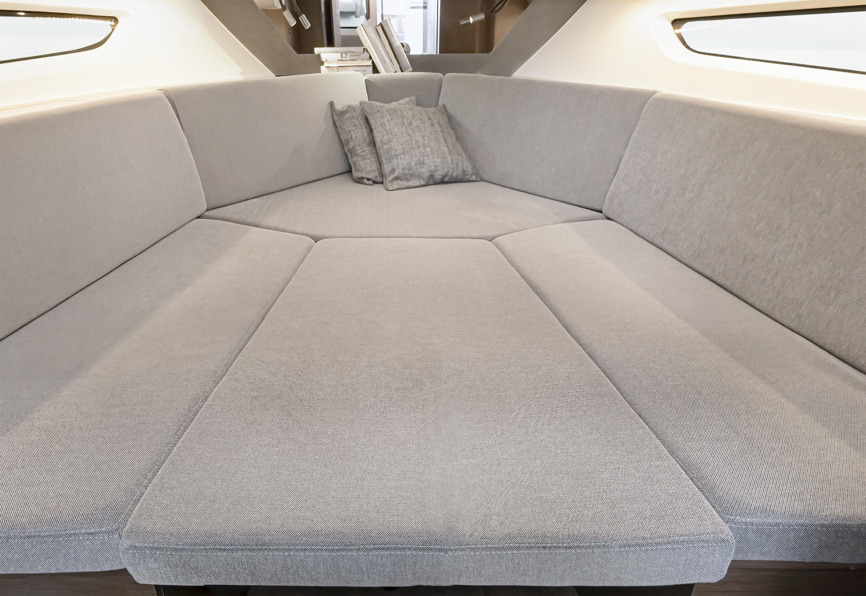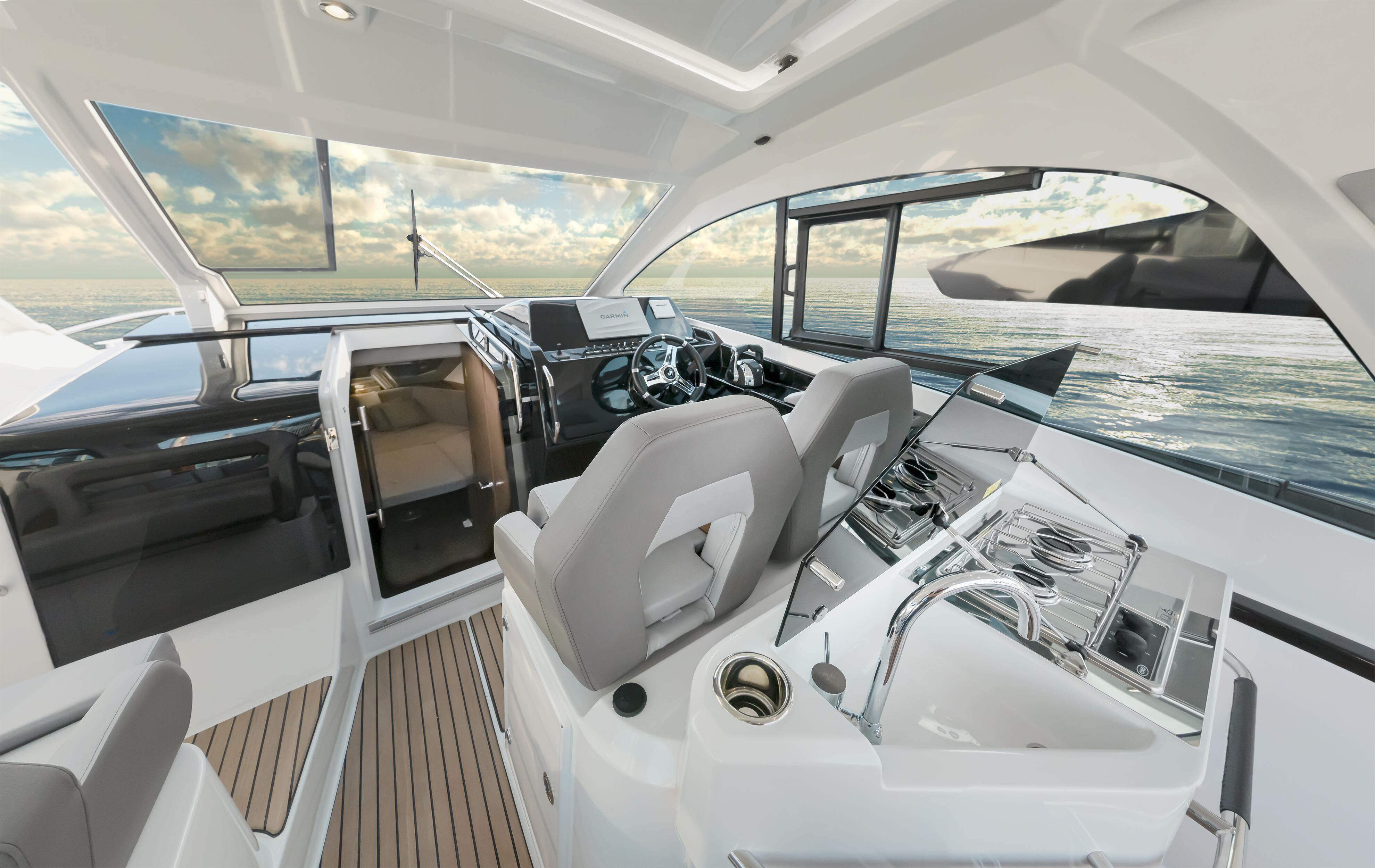 Sur le pont supérieur, l’articulation entre les différents espaces est harmonieuse, témoignant d’un bateau ingénieusement conçu. Doté d’une généreuse hauteur sous barot, le Gran Turismo 32 séduira ainsi tout adepte de la philosophie « open » qui jamais n’aura le sentiment de se sentir enfermé.
